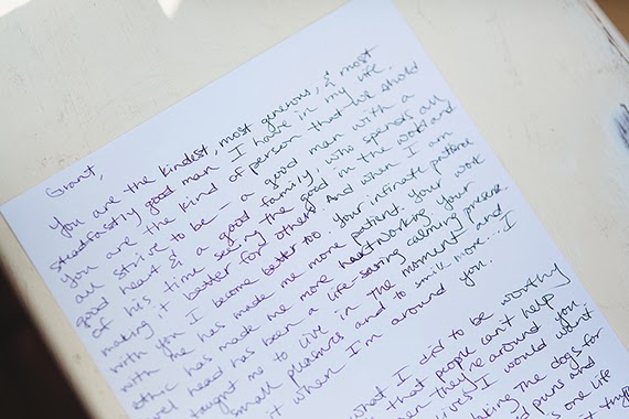 Grant and I had a fairly non-traditional ceremony. We asked his uncle Gifford to officiate, didn't have a ring exchange (ask to see my tattoo sometime!), had just one reading, and asked our fathers to participate in a Celtic hand fasting ceremony. Writing your own ceremony and vows is tough, but I really do feel like our ceremony was personal and touching... and was a perfect reflection of our love as a couple. If you're interested, here's our short ceremony.